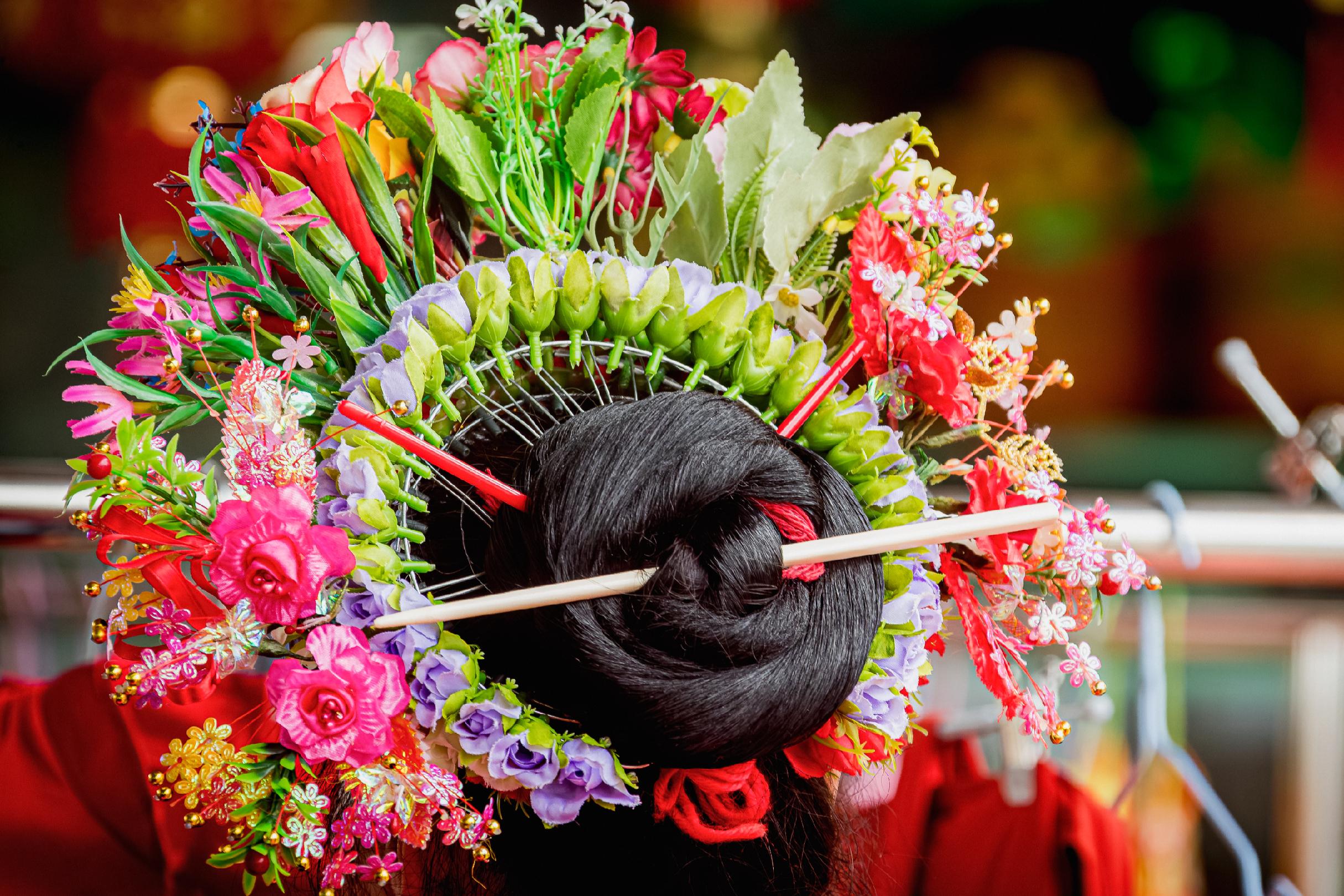 走进村口最热闹的 “簪花李姨” 小店时,屋内正围着几位来自广东的游客。年过六旬的李姨坐在竹椅上,左手托着装满绢花的木盘,右手捏着细铁簪,正给一位姑娘梳理头发。“咱们蟳埔女人簪花,可不是随便插几朵就完事儿的,有讲究哩!” 李姨的声音带着闽南话特有的软糯,手上动作却丝毫不慢 —— 先把客人的长发在脑后挽成圆髻,再用红绳固定,接着从木盘里挑出大朵的红色绒花,沿着发髻边缘插成一圈,又点缀上几枝白色茉莉与粉色蔷薇,最后别上两枚银质蝴蝶簪,“你看,这样既饱满又不压头,干活、走路都不掉。”