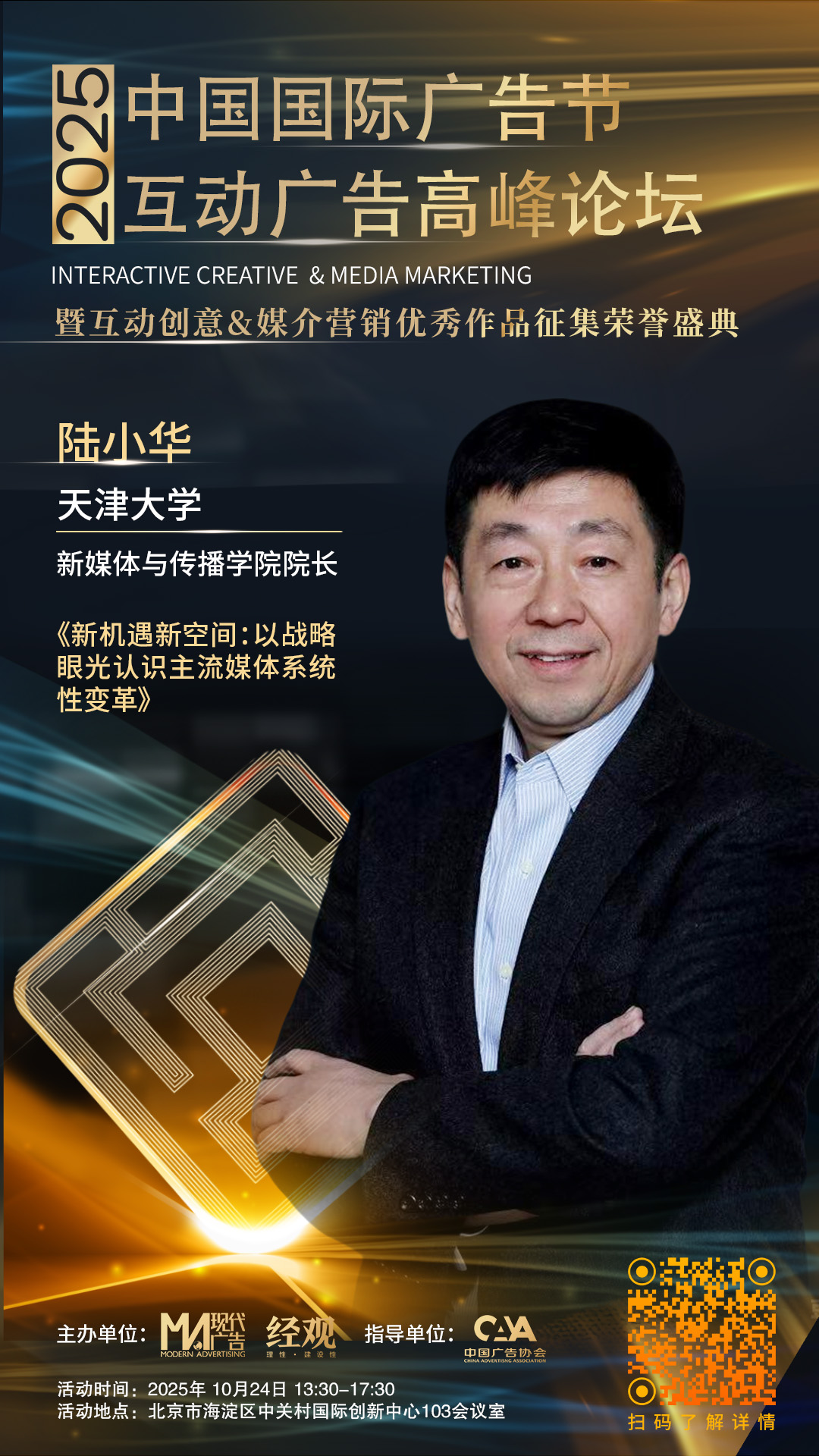 天津大学新媒体与传播学院院长陆小华确认出席2025中国国际广告节互动广告高峰论坛演讲。