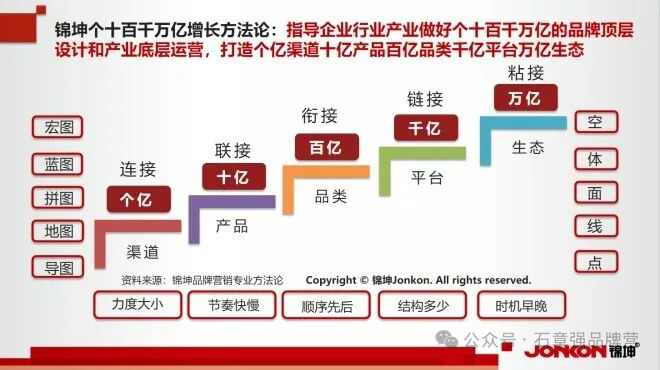 作为锦坤品牌创始人和资深品牌营销专家,石章强提出,企业只要找对了不同阶段更高阶段的成长和开拓逻辑,通过个亿-点-导图、十亿-线-地图、百亿-面-拼图、千亿-体-蓝图和万亿-空-宏图就可以相继从个亿奔向十亿、冲向百亿、跃向千亿甚至迈向万亿!