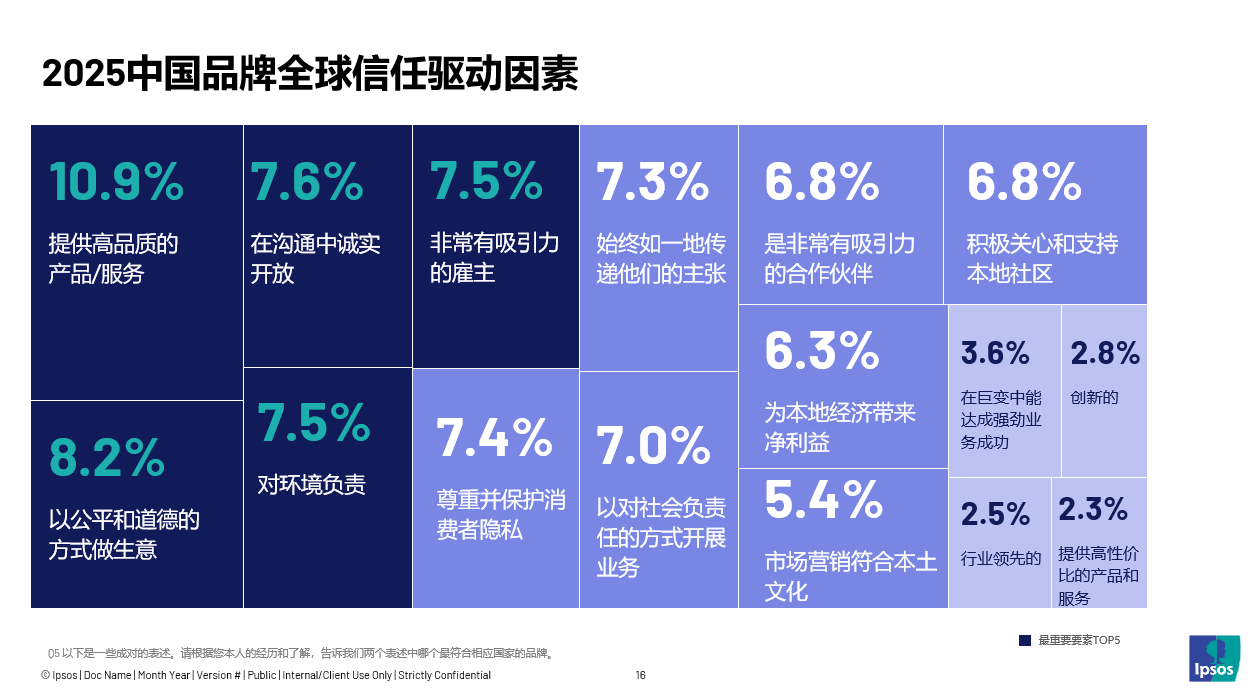 信任优化矩阵显示,2025年,中国品牌在“是⾮常有吸引⼒的合作伙伴”以及“为本地经济带来净利益”的两⼤重要驱动因素上的表现获得了全球消费者的认可,这也是连续追踪六年来,中国品牌的信任驱动因素第⼀次出现在第⼀象限:在重要的信任驱动因素上表现良好。