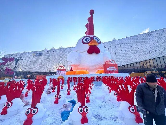 2025-2026冰雪季,蜜雪冰城与正新鸡排以一场极具视觉冲击的“冰雪之战”席卷哈尔滨。蜜雪冰城不仅在中央大街等核心地段设置了18米高的巨型“雪王”雪雕、带滑梯的冰雕城堡及4米高的水晶球雪王冰雕,更在“雪王方阵”的基础上,新增“百变雪王展”和主题快闪店,将哈尔滨打造为“蜜雪冰城”。紧随其后,正新鸡排带着4米高的“鸡王”发财主题雪雕与其“王座”也进军中央大街,与“雪王”上演“贴脸”式同框,被网友戏称为“哈滨绝代双骄”。