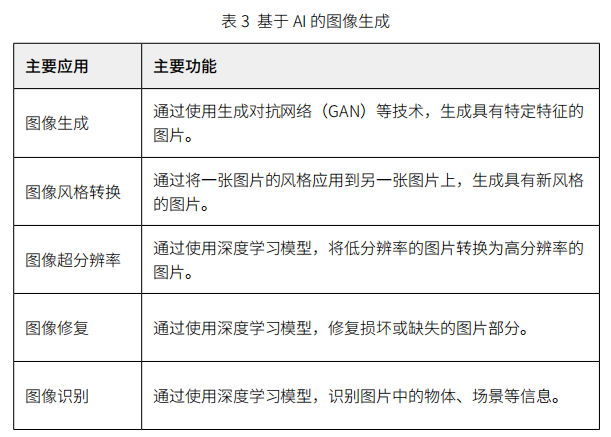 AI 技 术 主 要 包 括 机 器 学 习(machine learning,ML)、 自 然 语 言 处 理(natural language processing,NLP)、计算机视觉(Computer Vision,CV)等(见表 1),在内容生成的不同环节发挥重要作用,如通过生成对抗网络(Generative Adversarial Nets, GAN)、语言模型(LanguageModel, LM)自动化地生成内容,可以提高生成效率,减少人力成本和时间成本;根据用户的需求和偏好进行个性化定制,创造出更加丰富多样的内容,满足不同用户的需求;基于对用户的历史行为、兴趣爱好、社交网络等数据的分析,提升内容匹配度,提高内容的质量和可读性;根据当前各行业的热点,创造出全新的内容形式和风格,推动内容创新和发展。