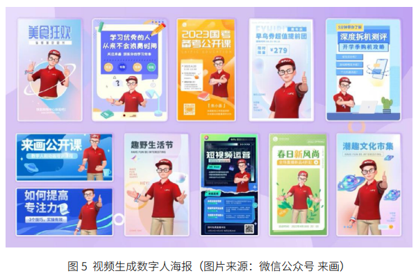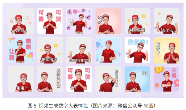 第五,在跨模态生成方面, AI 实现了文本、图像、音频、视频间的跨模态生成,包括文字生成图片、文字生成视频、图像生成文本、音频生成文本等。如 Runway 推出的Gen-2 工具,具备文字生成视频、文本 + 参考图像生视频、静态图像转视频、视频风格迁移(见图 1- 图 2)、故事板制作、伪装(Mask,如把正在行走的白狗变成斑点狗)、渲染等功能。实现了在没有人物、道具、摄像机的条件下从图文到视频的内容生成(见图 3- 图 4)。再如,中国动画和数字人智能生成平台——来画,结合 AI 生成字幕、AI 生成动画、AI 生成语音等功能,以海量创作素材为内容基础,智能生成博物馆、秀场、课堂、小镇等元宇宙空间、数字人海报(见图 5)、数字人表情包(见图 6)、数字人动画等内容,自由调整身高、体重、发型、脸型、五官等参数,快速活化品牌 IP 价值,积累 Z 世代品牌用户,吸引元宇宙流量。此外,AI 还实现了以 Game AI 中 AI bot 为代表的策略生成,如 NPC 逻辑及剧情生成、游戏关卡生成、数字资产生成等,为广告提供了更广阔的创意空间。