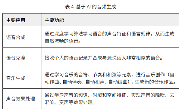 第三,在音频生成方面,深度学习算法和神经网络可以帮助计算机学习音频信号的特征和模式,并生成新的音频信号。通过生成模型,AI 技术已经被广泛应用于语音合成、语音克隆、音乐生成等领域(见表 4)。其中,基于循环神经网络(RNN)的生成模型,如 LSTM 和 GRU,已经被广泛应用于音频生成领域。此外,还有一些基于变分自编码器(VAE)和生成对抗网络(GAN)的生成模型,也被用于音频生成。例如,通过 Adthos 推出的 AIGC 广告平台,可以基于浏览器的多轨编辑器进入并编辑广告音频,添加画外音、音效和音乐,助力生成“完全自动化”的广告,最终通过与无线电自动化系统和广告服务器的集成来播放。