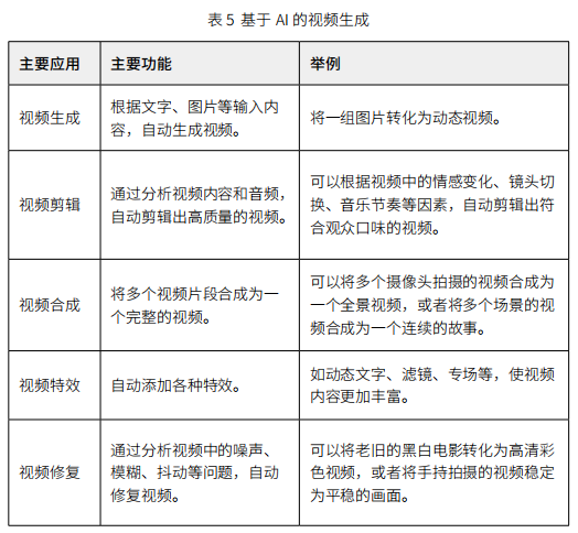 第四,在视频生成方面,将大量的图像、视频、音频等数据输入到神经网络中进行训练,通过深度学习及其相关算法(如反向传播算法、梯度下降算法等)帮助生成模型不断优化自身,学习和模拟人类创造的视频内容。此外,AI技术还在视频属性编辑、视频自动剪辑及视频部分编辑等方面发挥作用(见表 5)。视频属性编辑包括删除特定主体、生成特效、跟踪剪辑等,能够高效节省人力和时间。AI 能通过对画面人物的动态追踪,自动搜索人物,定位关键时间节点,极大提升剪辑效率。此外,AI 能去除视频的拍摄抖动,修复视频画质。