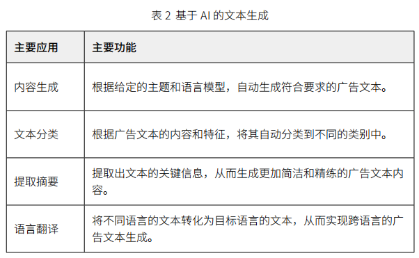 第一,在文本生成方面,AI 可以通过生成模型来自动产生符合语法和语义规则的广告文本,包括以结构化写作(如标题生成)或非结构化写作(如自动续写)为代表的非交互式文本(non-interactive text),和以文本游戏为代表的交互性文本(Interactive text),主要应用包括文本分类、提取摘要、语言翻译、内容生成(见表 2)。例如基于循环神经网络(RNN)的生成模型,如长短期记忆人工神经网络(LSTM) 和门控循环单元 (GRU),已被广泛应用于文本生成领域;一些基于变分自编码器(VAE)和生成对抗网络(GAN)的生成模型,也已被用于文本生成领域。这些技术可以应用于广告文案写作与翻译等。例如,Copy.ai 是一款用于生成广告和营销文案的 AIGC 工具。它基于生成型预训练变换模型 3,即 GPT-3(Generative Pre-trained Transformer 3),可以在数秒内生成广告和营销文案,并翻译 25 种不同的语言。它包含 70 多个 AI 模板,能将创作文案的构思时间大幅缩短。