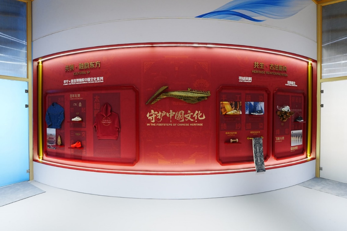 “守护中国文化”主题展区,呈现李宁与故宫博物院中国文化系列,李宁经典鞋款上中国传统工艺、材料、建筑灵感的运用,以科技、创新与拼搏精神融合之力,推动传统文化现代表达。