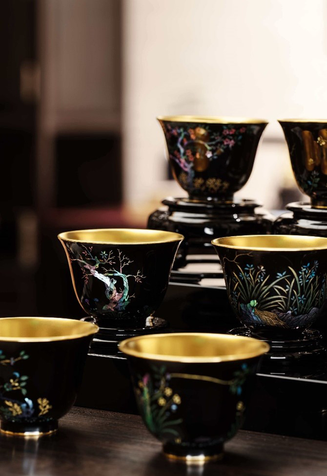 传统螺钿漆器原以木料为胎,老铺黄金古法革新,以足金为胎,将足金与漆器螺钿工艺融合,首创“十二月花神漆器螺钿足金金杯”。
