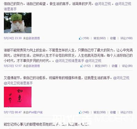 三是在河北电视台官微上举办竞猜、抽奖的活动,每次转发的数量都能到几十万量级。但这也是不断试错的成果。“我们也注册了‘河北卫视谁是高手’节目微博,但是没有粉丝基础,互动的情况不佳,而且季播结束之后,这个账号的意义也不大。因此我们把活动放在粉丝量较多的‘河北电视台’上。”