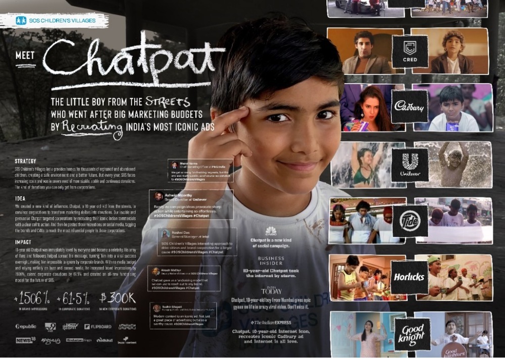 10岁的查特帕特立即收获到了所有人的喜爱,成了一个名人。他的粉丝和追随者大军帮助他传播信息,使他一夜之间获得了病毒式的成功,使他成为了不能被这些企业品牌忽视的存在。没有媒体预算,完全依靠公众的支持还有免费的媒体宣传,他增加了1506%的品牌印象,增加了61.5%的企业捐款,并为SOS组织的未来创建了一种全新的筹资模式。