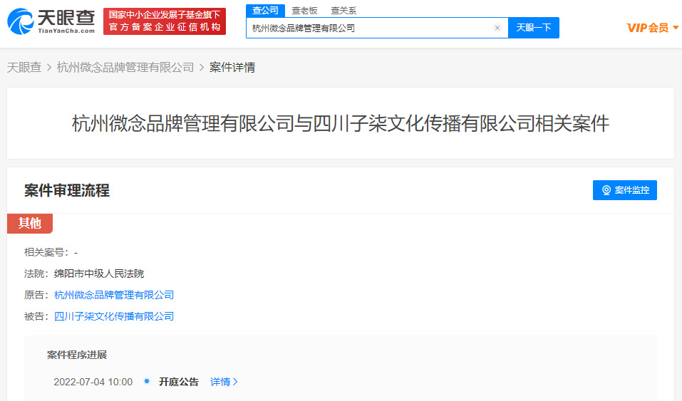 天眼查App显示,近日,杭州微念品牌管理有限公司与四川子柒文化传播有限公司(以下简称:四川子柒)相关案件新增开庭公告,原告为杭州微念品牌管理有限公司(以下简称:微念),该案将于7月4日在绵阳市中级人民法院开庭。