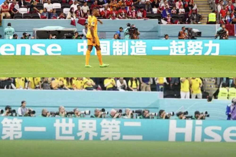 11月29日,不少观看卡塔尔世界杯比赛的观众发现,海信场外围挡广告语已经将“中国第一,世界第二”换成了“中国制造,一起努力”。