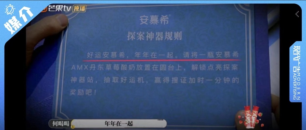 例如,在嘉宾领取“探案神器”环节,节目增加了将赞助方品牌酸奶放置在圆台上,抽取某个数字,即可获得“搜证环节加时一分钟”的特权。但可惜的是,嘉宾要做的动作只是将安慕希酸奶放在正确的位置上,与所谓的“特权”并没有直接的逻辑关系,相对有些生硬。