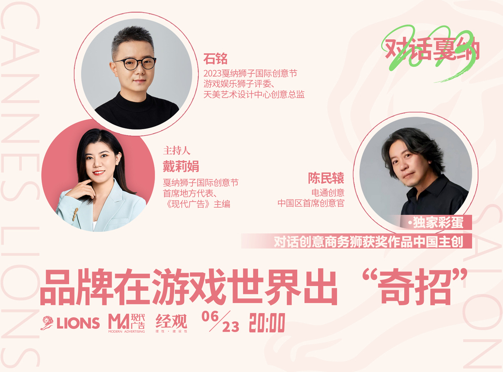 在《现代广告》杂志社推出的《对话戛纳》系列直播第二季第四期邀请到2023戛纳狮子国际创意节游戏娱乐狮子评委、天美艺术设计中心创意总监石铭、电通创意中国区首席创意官陈民辕,探讨当越来越多品牌卷到虚拟世界,游戏营销该怎么突破?