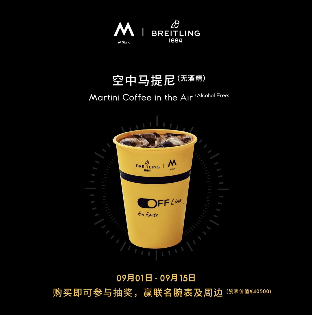 M Stand虽然联名的是瑞士制表商百年灵,但是以“Off line”为灵感,M Stand推出的是具有马提尼风味的空中马提尼无酒精特调,且周边产品之一为联名酒壶。瞄准的场景,是需要放空一下,准备下一次启程的白领们。