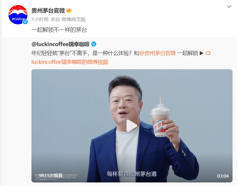 从品牌的角度出发,走平价路线的瑞幸咖啡和高端白酒贵州茅台之间有着明显的反差感,且两者的消费群体具有着高度互补性。瑞幸咖啡的主要群体大多是年轻的职场新人,而被定义为“老字号品牌”的茅台作为高端白酒,饮用场景总体上来说更商务,更传统。