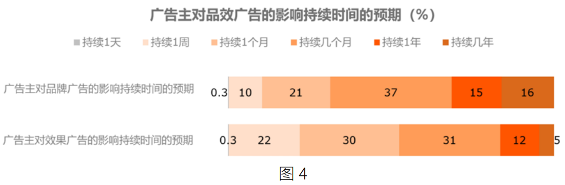 特殊时期,广告主对效果广告增加投入,并不意味着其对品牌广告降低依赖。调查中,有 66% 的广告主认可“当下效果广告遇到了流量见顶、成本居高的瓶颈,品牌广告价值也有回归之势”。对比效果广告的短期实效性,品牌广告需要长期的投入才能累积价值,二者皆不可偏废。因此,广告主期待能在品效广告的“此消彼长”中,找到短期价值和长期价值的最佳平衡点,做到品效协同。在被问及“品牌广告和效果广告的影响各持续多长时间,比较符合预期”时,除长短极值外,被访广告主选择品牌广告和效果广告能持续 1 个月、持续几个月、持续 1 年的比例趋于相当。这表明,广告主的品效决策受到价值升级的影响,对二者都提出了更高要求,他们期待品牌广告能在更短时间内起效,效果广告的影响时间拉长,在全年的营销计划中,二者持续时间相互重叠,传播作用相互叠加。