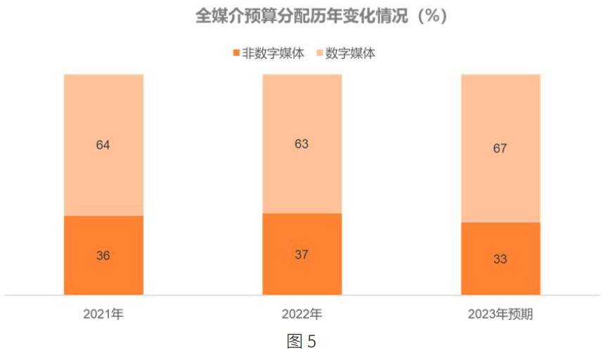 媒体投放结构方面,广告主营销预算向数字媒体转移的趋势仍在继续。调查数据显示,2022 年,数字媒体预算分配占比为 63%,相比 2021 年的略微下降 1 个百分点,整体基本趋稳。2023 年,数字媒体预算分配预期将达到67%,是非数字媒体预算的两倍。