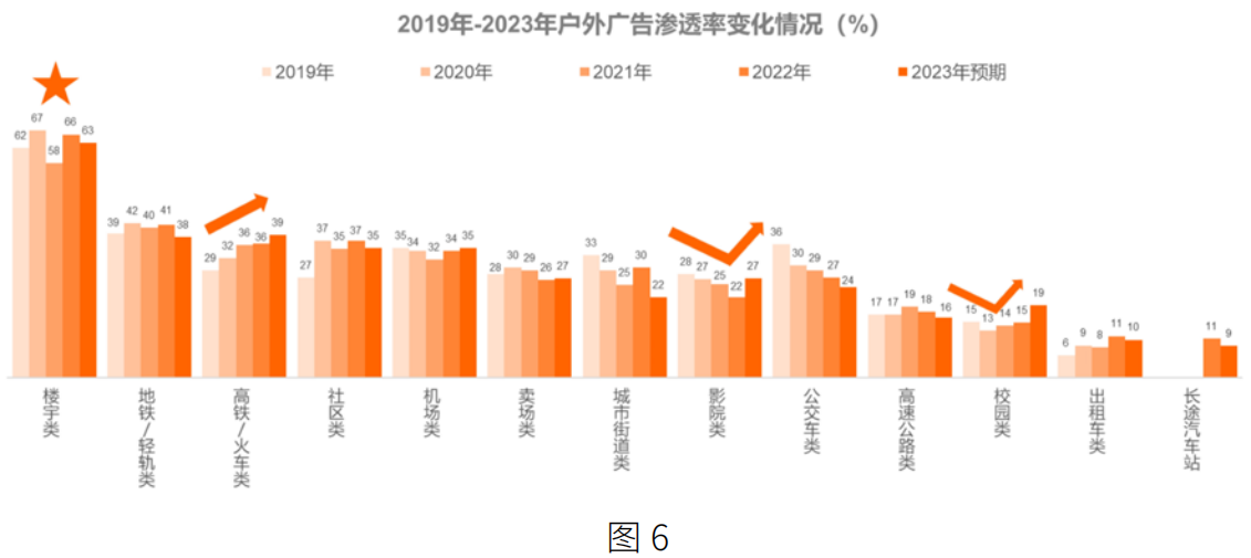 三是广告主追捧具备高营销价值的户外媒体。深访中绝大部分广告主表示,在选择户外媒体时,会注重其在高流量地段、高精准人群、高关注时节、高销售转化等方面的营销价值。比如,某数码 3C 品牌表示:“我们不会全年去投户外广告,而是要看几个核心时间点,比如 2022 年冬奥会期间我们集中做了机场、高铁站的户外广告。”另外广告主对户外媒体价值的判断也影响了不同户外广告类型渗透率的变化趋势。调查数据显示,2019 年 -2023 年期期间楼宇类广告渗透率稳居首位,影院类、校园类广告伴随线下回暖呈复苏态势,高铁 / 火车类广告渗透率则持续上升。