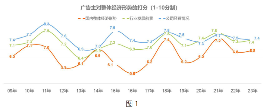 2023 年,广告主信心指数虽高于疫情之初,但相较2022 年变动幅度并不大。具体来看,广告主对国内整体形势的信心指数为 6.8 分,对行业发展前景的信心指数为 7.4分,相比 2022 年数值平稳略升。广告主对公司经营情况的信心指数从 2022 年的 7.5 分下降至 2023 年的 7.4 分。