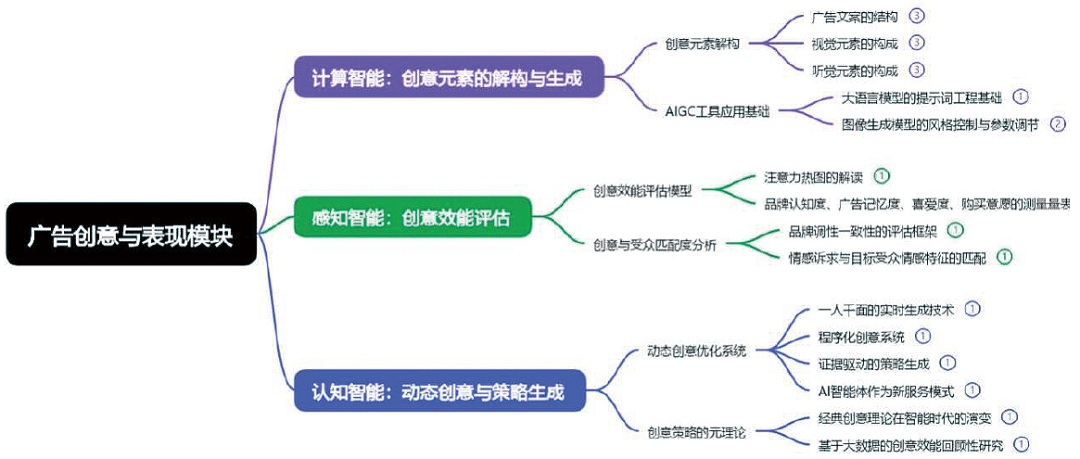 图2~图5中,计算智能-感知智能—认知智能的分层逻辑,是将智能技术从基础数据处理,到理解世界,再到生成决策的升维旅程,融入到调查、策划、创意、投放的四大广告核心业务模块,从而培养出融合技术、创意和产品思维方式的复合型人才。