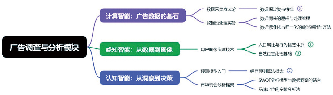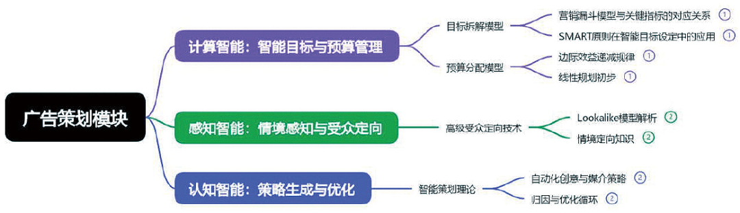 计算智能位于理论型知识图谱的底层,着力解决如何收集、处理数据和执行规则的问题。它关注的是基础性的数据工程、算法执行和规范性操作,是所有智能活动的基础。如在广告调查与分析模块,聚焦于数据采集方法论、数据清洗的逻辑与处理流程。这直接映射到宏观的聚类#2智能算法与模型实践中所要求的特征工程和数据处理能力。在广告策划模块的“智能目标与预算管理”,侧重于将商业目标转化为可计算的规则。例如,教授预算分配模型、边际效益递减规律的计算,以及如何基于营销漏斗模型与关键指标进行目标拆解。这体现了计算智能在策略制定中将宏观决策工程化的能力。而在广告投放与反馈模块的“程序化交易与投放”,是计算智能在实战中的集中体现。要求学生掌握RTB实战的流程、出价策略以及投放平台的自动化规则设置。这些都是依赖精确的计算逻辑和自动化系统执行的知识点。
