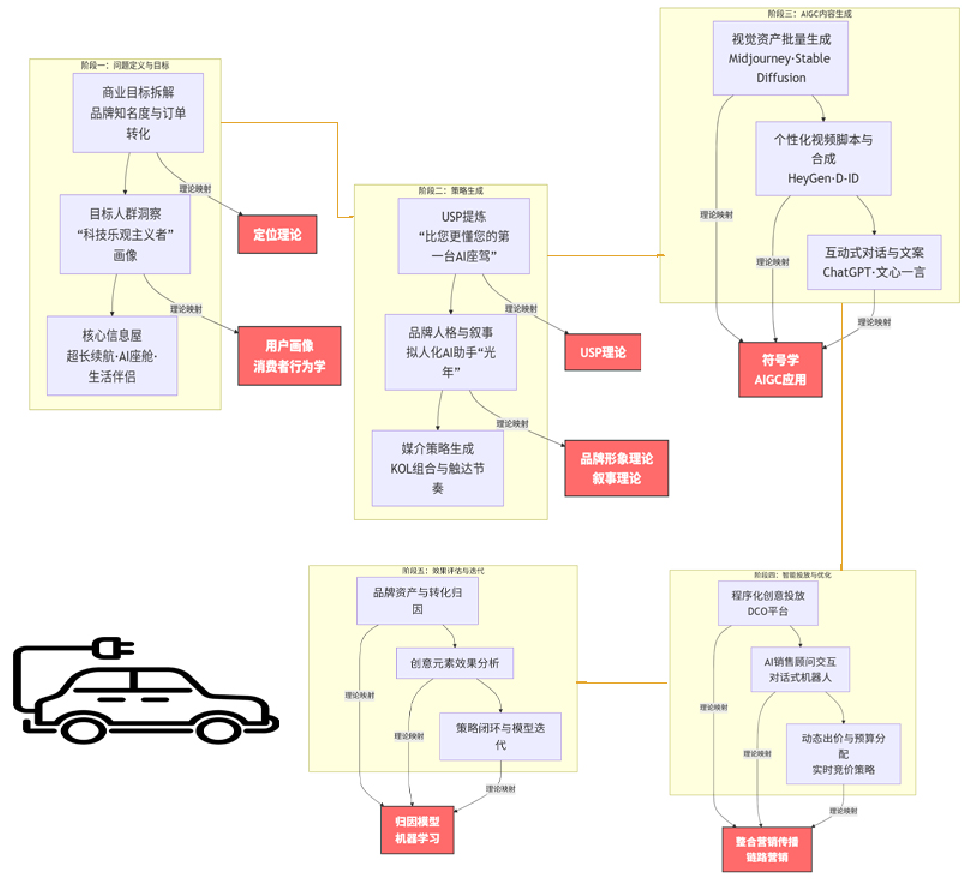 产业型知识图谱更好地服务场景化教学,学生能直观看到用户画像如何用于精准投放,AIGC创意如何与效果优化形成数据闭环……。在具体课堂教学中,教师可结合代表性的行业案例,更好地揭示智能一体化逻辑。图6是以某新能源汽车品牌上市活动为产业实例,展示核心工作流程、决策点及理论根基。