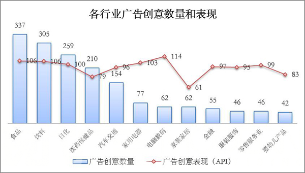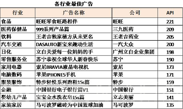 日化行业,此次的行业最佳属于立白;汽车行业,一汽大众无论在广告数量和表现中都比较优秀,共有13条广告,仅次于东风日产的19条,但是其平均表现得分为137。
