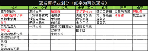 天喔蜂蜜柚子茶、红牛、加多宝、珀莱雅、步步高vivo、洁丽雅、贝因美为两次冠名节目