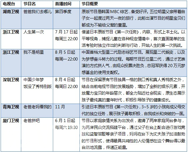 “限唱令”后,中央电视台的《梦想星搭档》、江苏卫视的《全能星战》都延期播出;江西卫视的《中国红歌会》暂时停播;青海卫视《花儿朵朵》决定不再制作播出……。从各大卫视已有的编排来看,亲子秀将成为接下来荧屏的主角。截至目前,已有湖南卫视、浙江卫视、青海卫视三家卫视瞄准了明星亲子秀节目,将在今年内陆续推出。