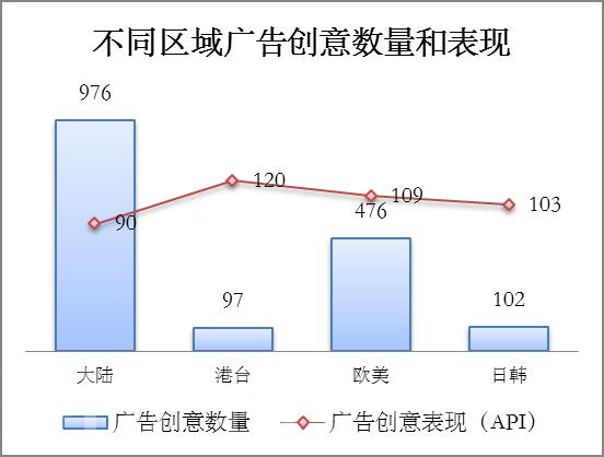 基于浩顿英菲ADEvaluation广告效果评估系统的分析结果显示,在2013年上半年,大陆品牌的广告共计976条,是欧美品牌广告的2倍,远高于港台和日韩品牌的广告数量。虽然本土广告数量上占据绝对优势,但是就广告表现而言,大陆品牌的广告表现反而最低。