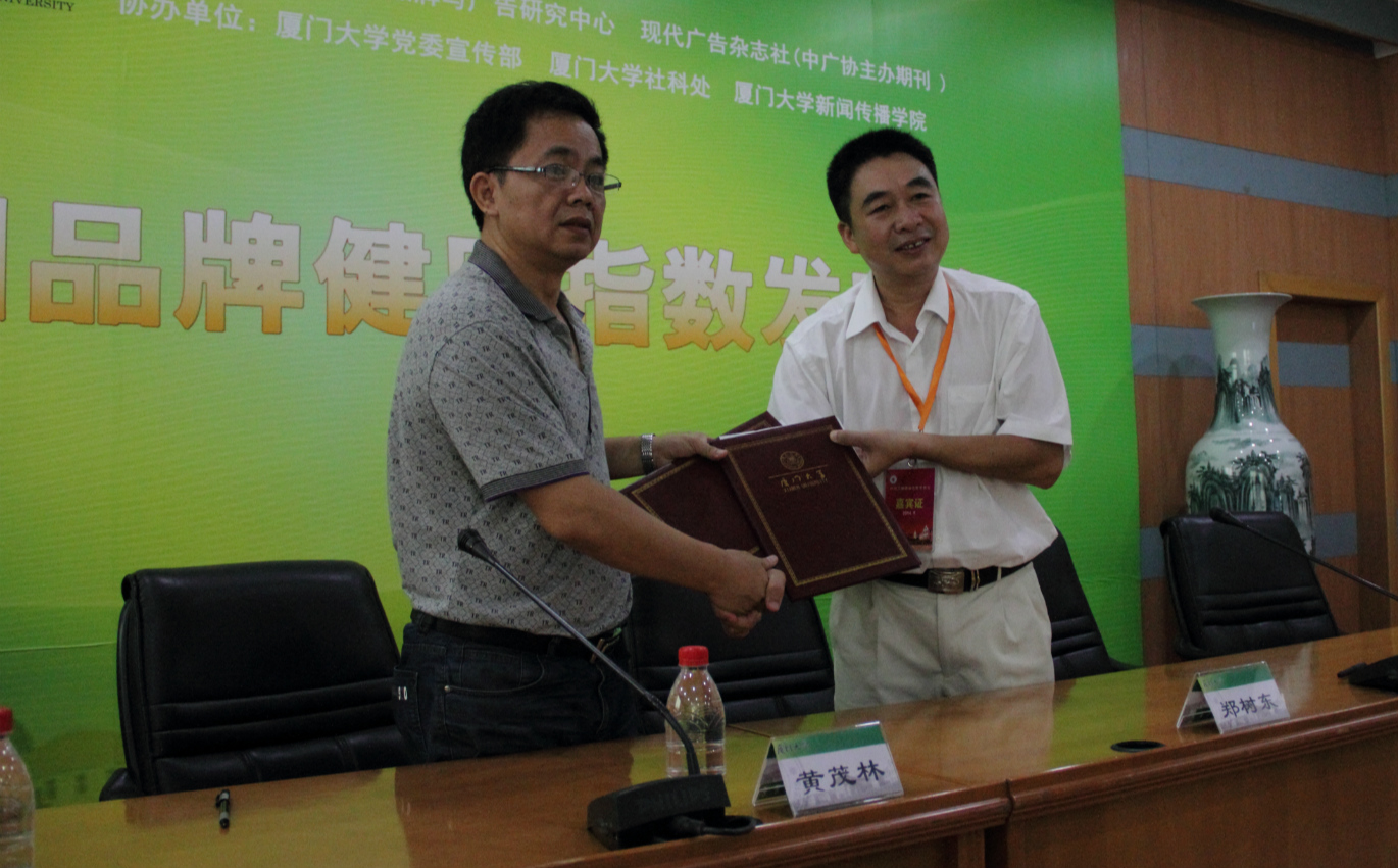 在此次发布会上,厦门大学新闻传播学院党委书记郑树东代表研究中心与厦门大学出版社签约,将《中国市场品牌健康监测报告(2013)》、《中国品牌百科全书(食品卷)》两份研究成果公开出版发行。【链接】