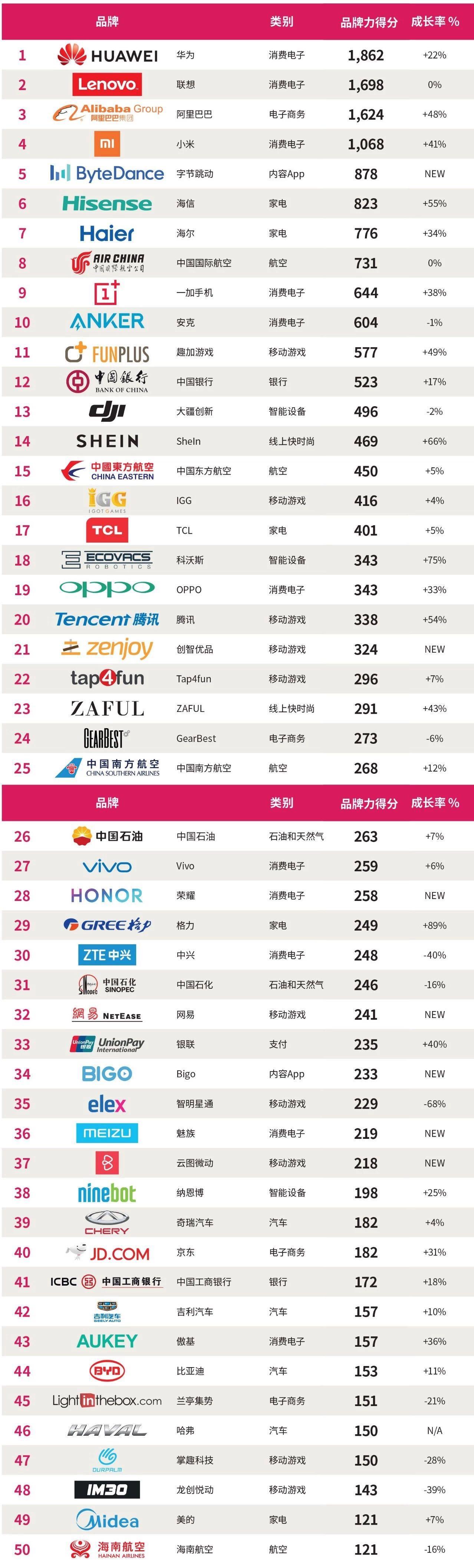 如榜单第10、43名的消费电子品牌安客、傲基,第11、16、35、47、48名的移动游戏品牌FunPlus、IGG、智明星通、掌趣科技、龙创悦动,第14、23名的线上快时尚品牌SheIn和Zaful,第24、45名电子商务品牌GearBest、兰亭集势,以及第38名的智能设备品牌纳恩博。