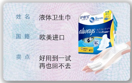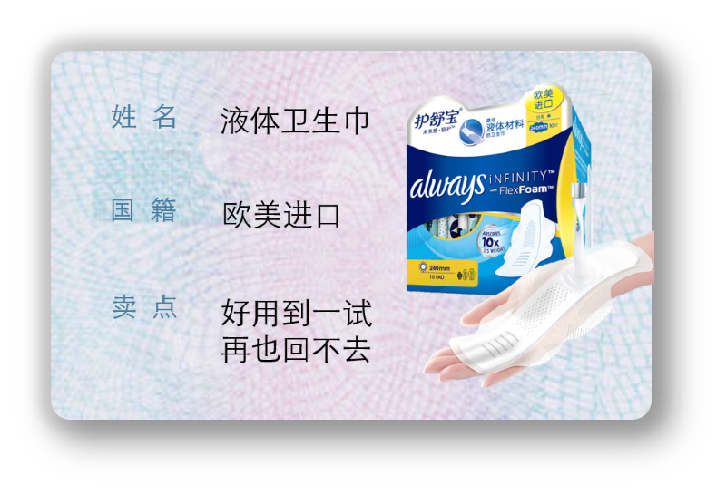 护舒宝有一款产品在2018双十一完成了一天一亿的销售。这款产品最开始在中国上市的时候,护舒宝想了很多的包装文案,如“护舒宝未来感极护卫生巾”“卫生巾中的爱马仕”“说女人是水做的,所以要用水做的卫生巾”……从各个角度去诠释产品特征,但是最后让它成了一款网红产品的是“液体卫生巾”。