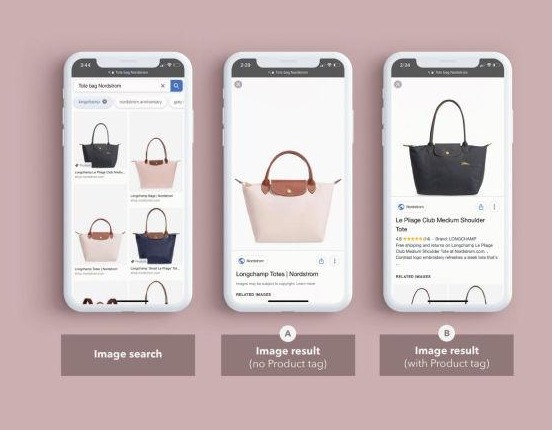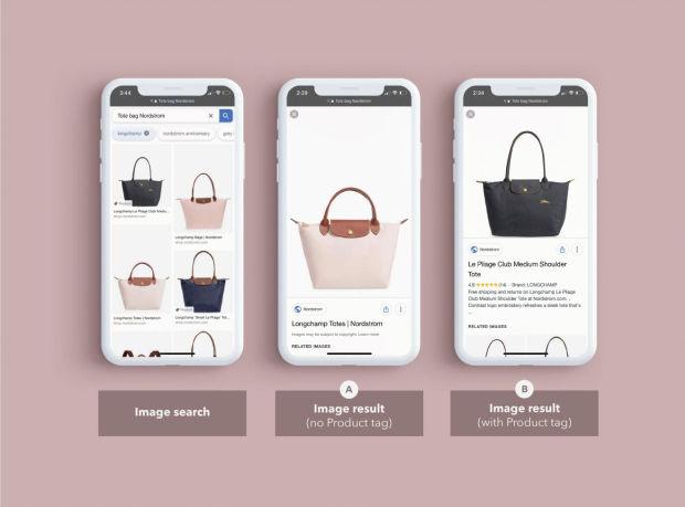 以下是Google图片搜索结果的两个示例:选项(a)没有产品标记,选项(b)包含产品标记。您认为哪项对在线购物者更有帮助?